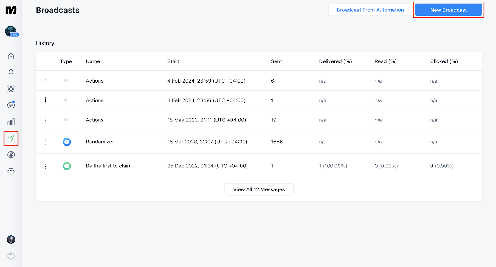 You can send bulk SMS messages to your contacts who have opted in by using the SMS feature in Manychat. To start a new SMS broadcast, you need to go to the Broadcasting section of Manychat, click the New Broadcast button, and select the SMS channel: