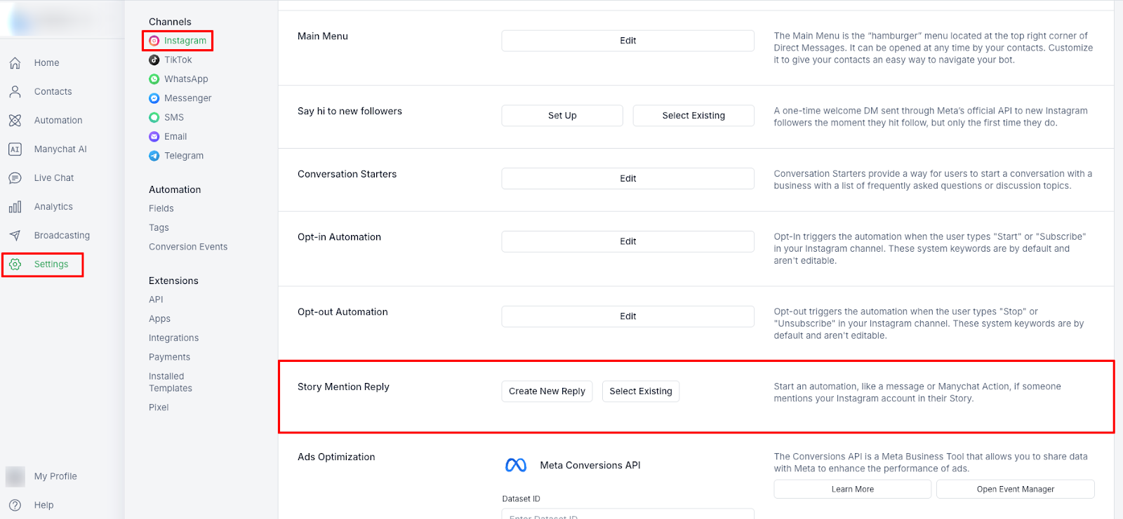 Select an existing automation as an Instagram Story Mention reply