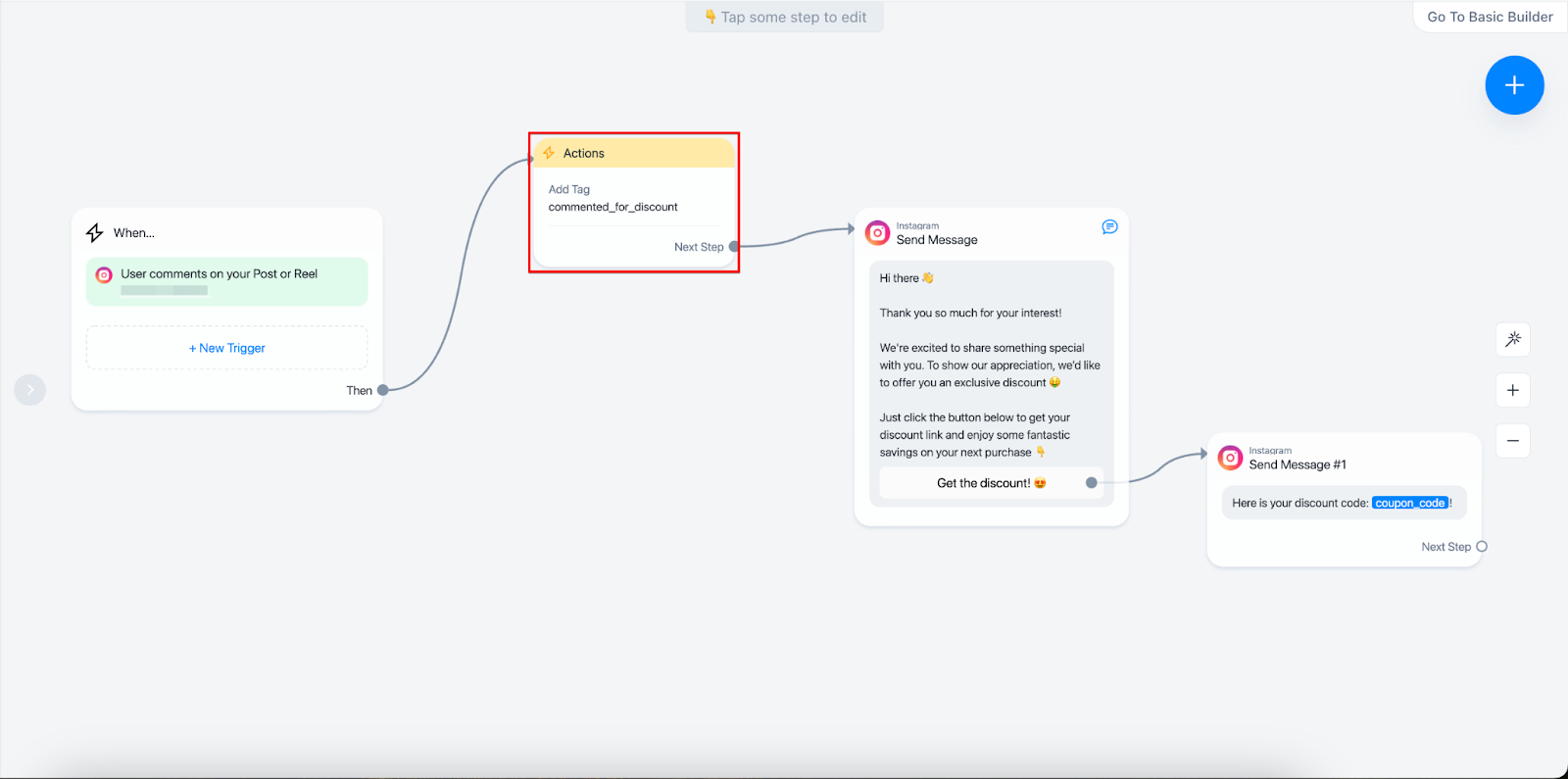 - For example, you can add an Action to automatically tag contacts in Manychat — useful if you want to label users who opted in through a specific campaign.