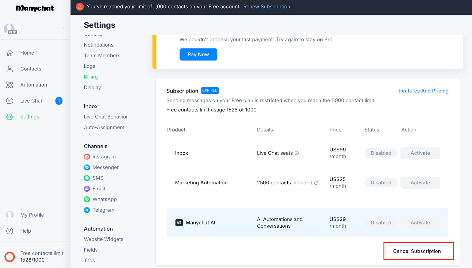 Issues with setting up your Manychat Pro subscription