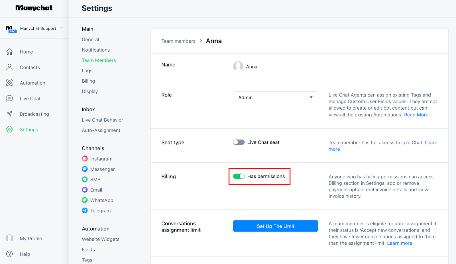 💡 Tip: If you don’t see the Billing tab, ask the account owner or an admin to grant you billing permissions. They can do this by going to Settings, switching to the Team Members tab, clicking the Edit button next to your name, and turning on the Has permissions toggle.