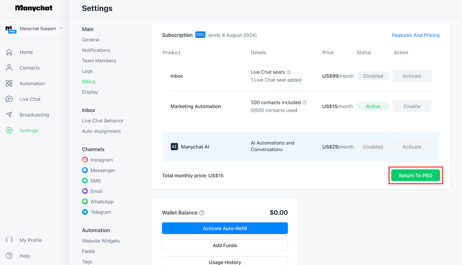 1. Open your Manychat account, head to Settings → Billing, and click the Cancel Subscription button:
