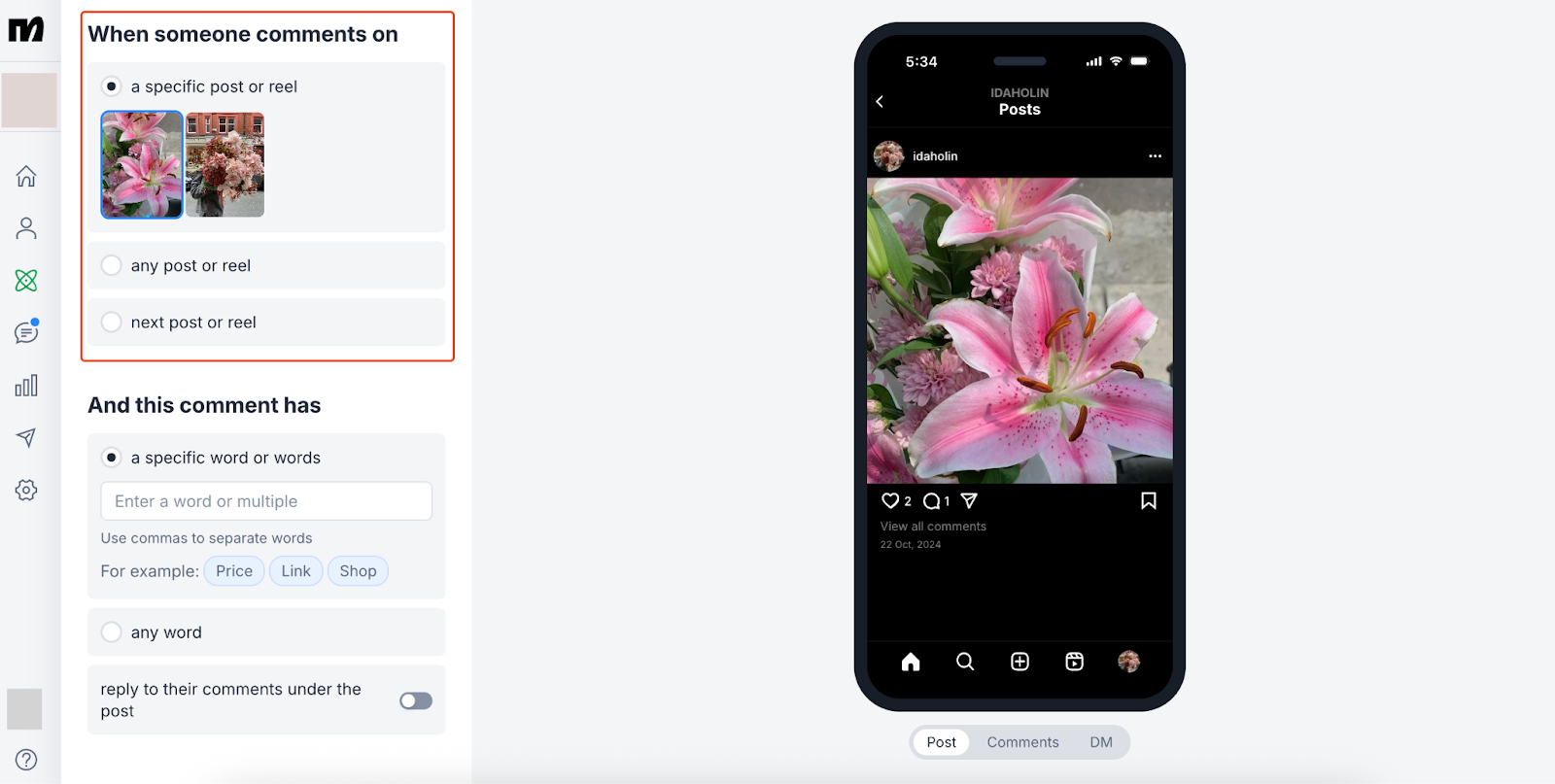 - A specific post or reel: only comments under this post or reel will trigger the automation.