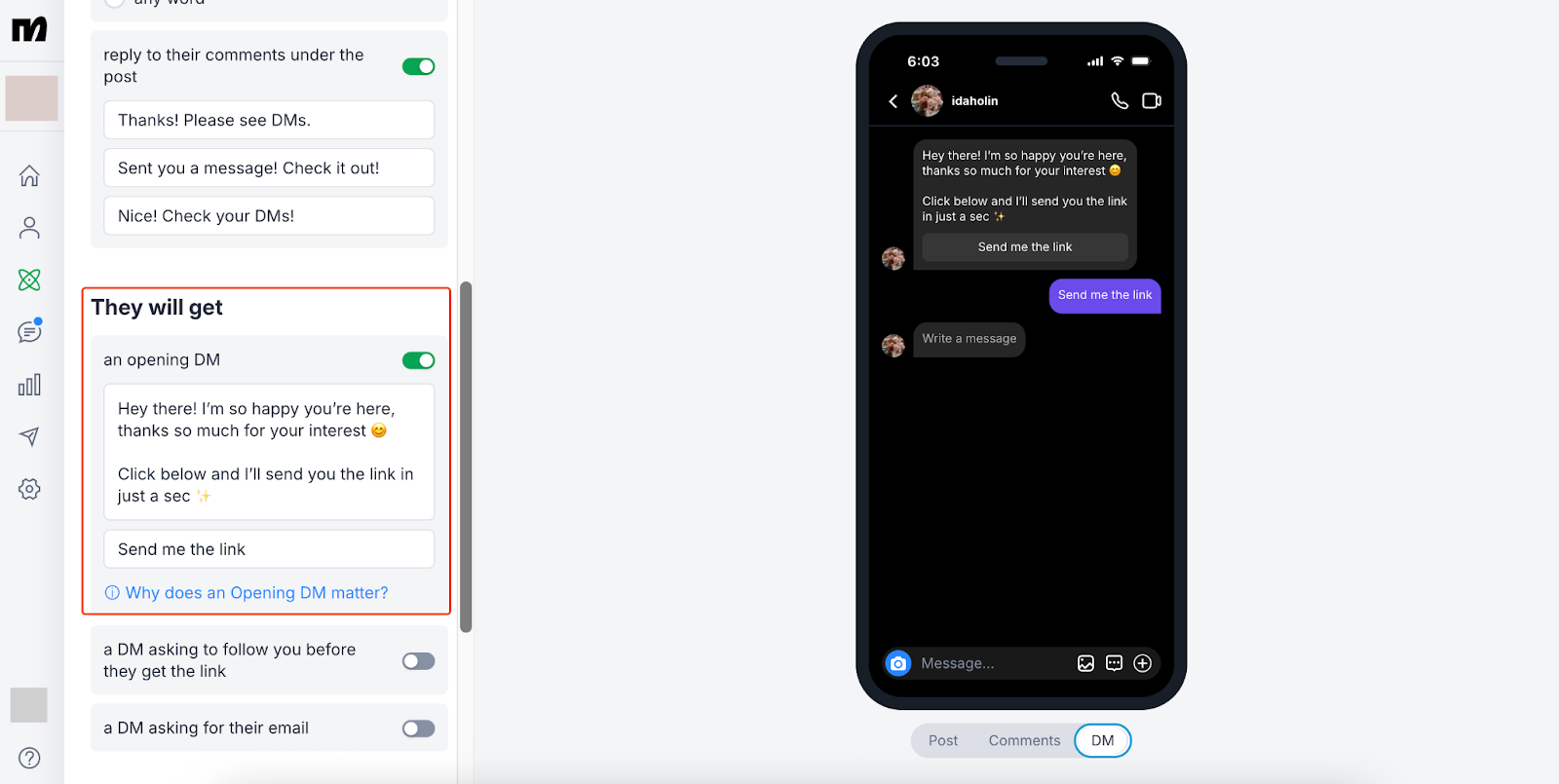 - Next, choose what contacts will receive in their DMs. If the Opening DM is disabled, this message becomes the very first DM contacts receive after they engage with the selected post or reel.