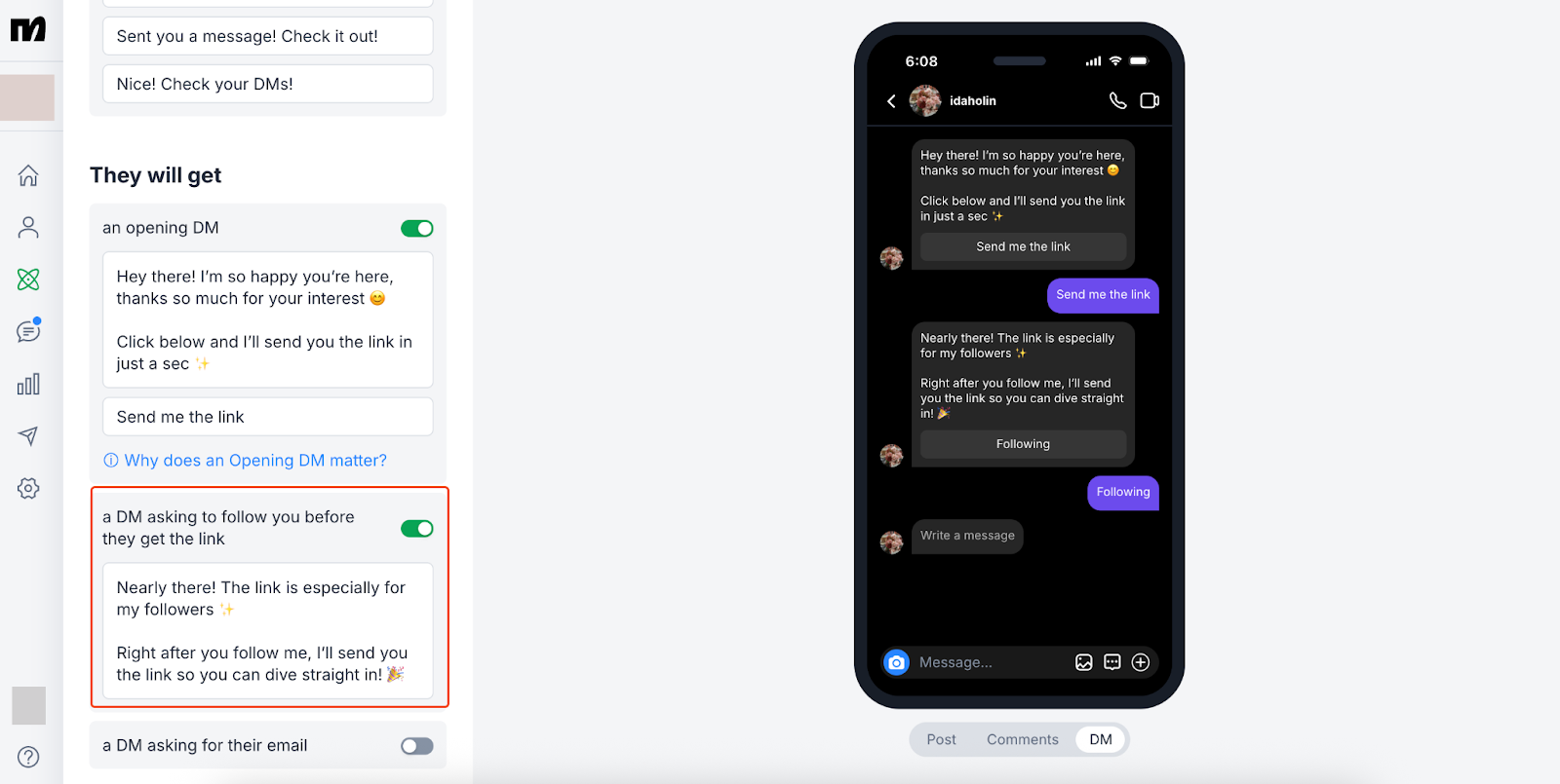 Optional: Ask users to follow you before receiving the link. Manychat can check whether a user already follows your Instagram account. If they don’t, an additional DM will prompt them to follow you before the link is sent. This helps encourage audience growth while ensuring your content is shared with engaged followers only.