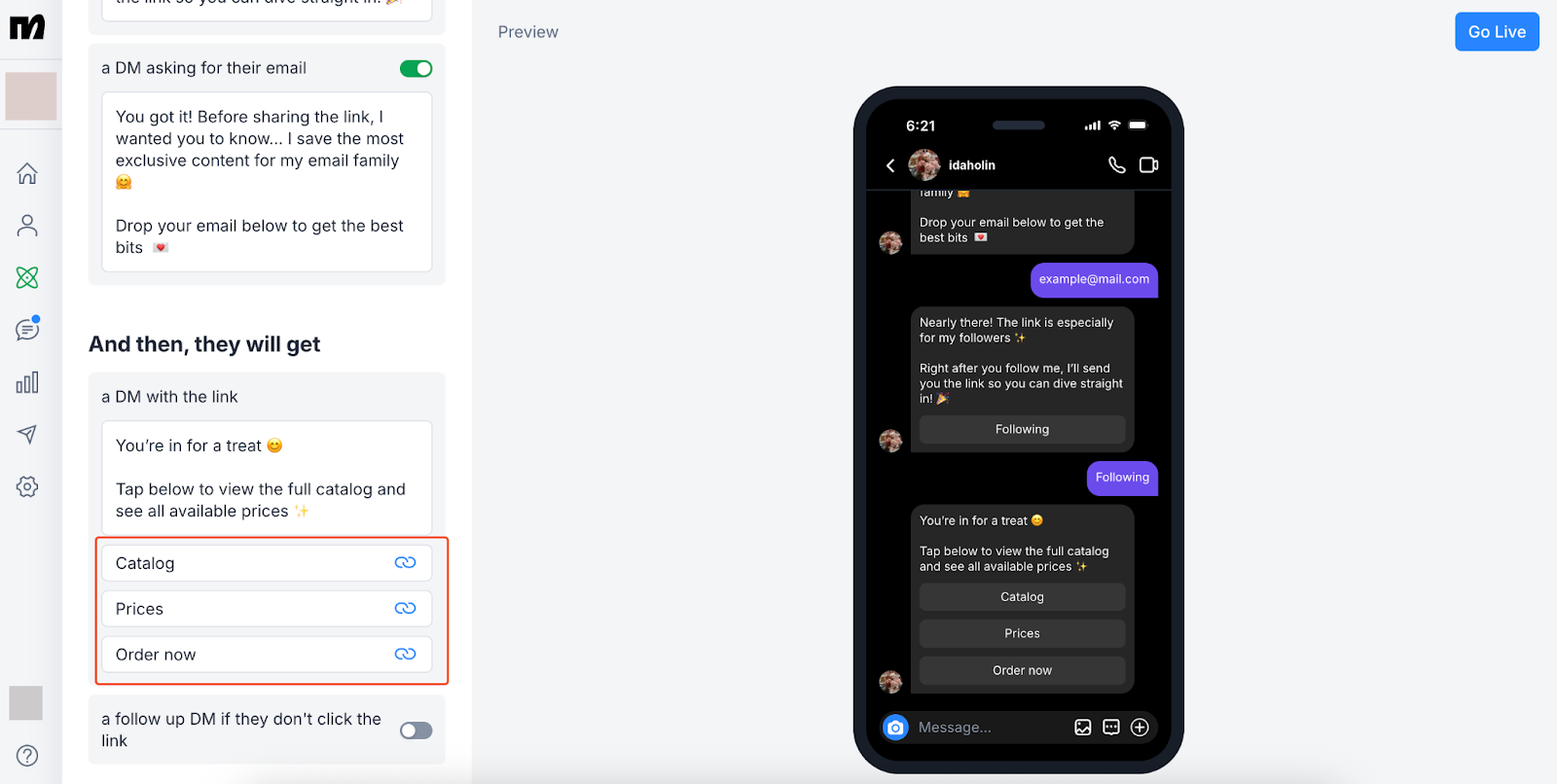 You can set up the Auto-DM links from comments automation directly from the Manychat mobile app. It works on both iOS and Android and only takes a few minutes to complete.