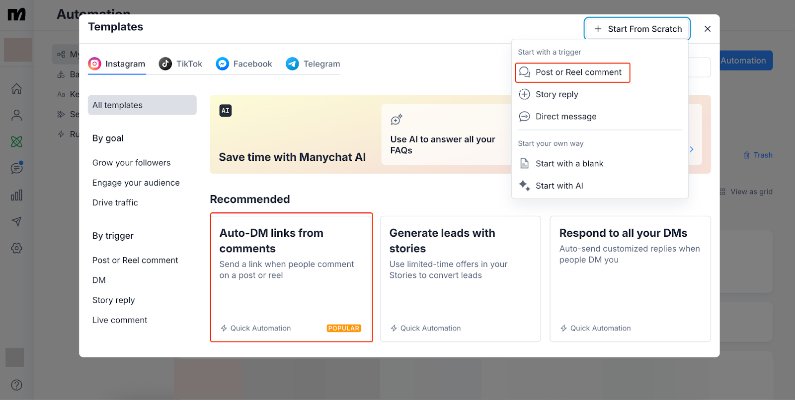 - In the pop-up that opens, select Auto-DM links from comments or click + Start From Scratch and select Post or Reel Comment.