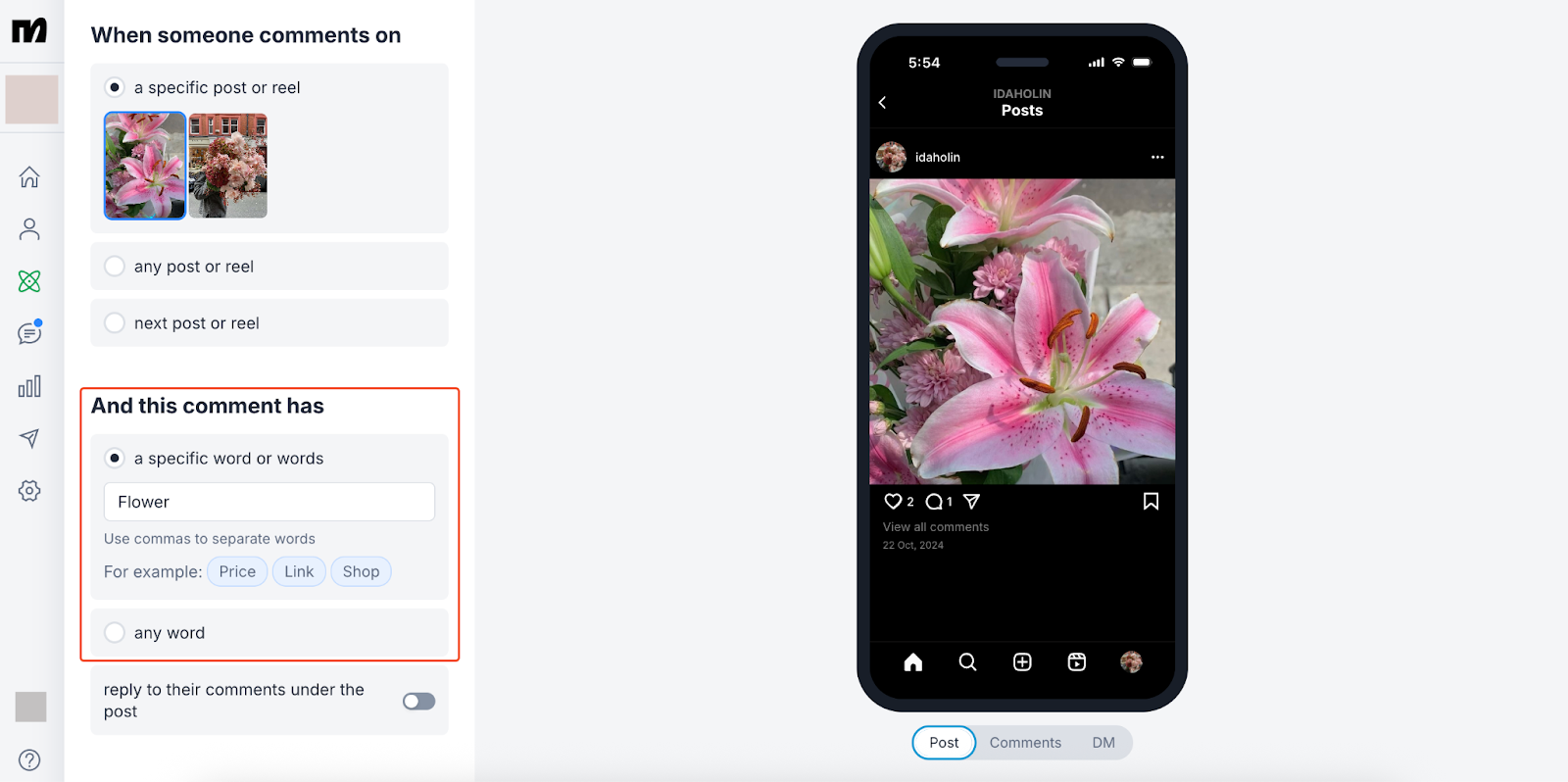 - Then decide which words a comment must include to trigger the automation, or allow it to run for any comment.
