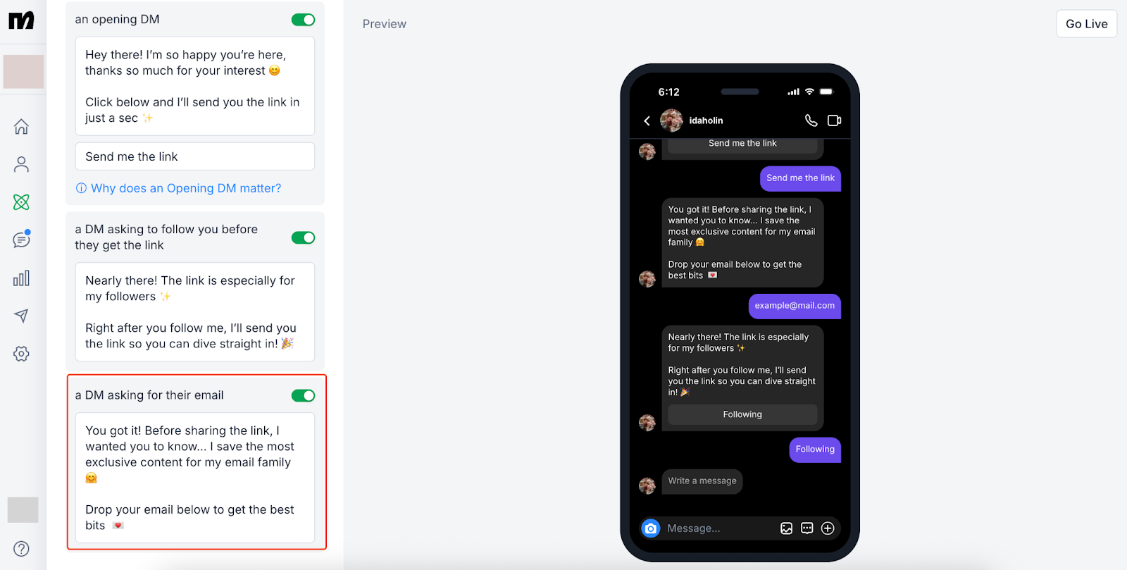 - Once your setup is complete, click Go Live in the top-right corner to activate the automation.