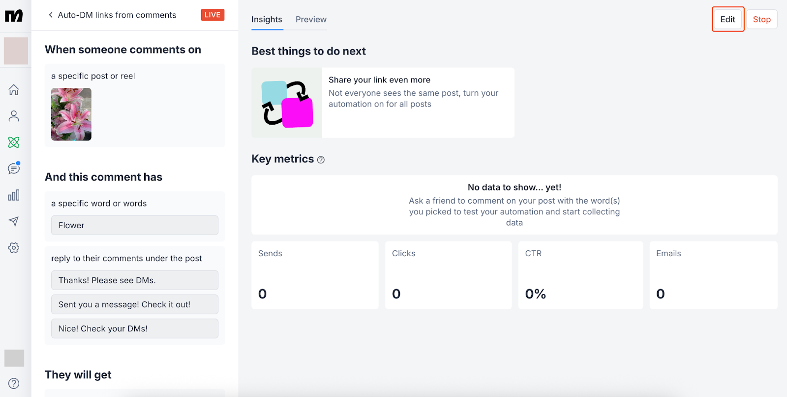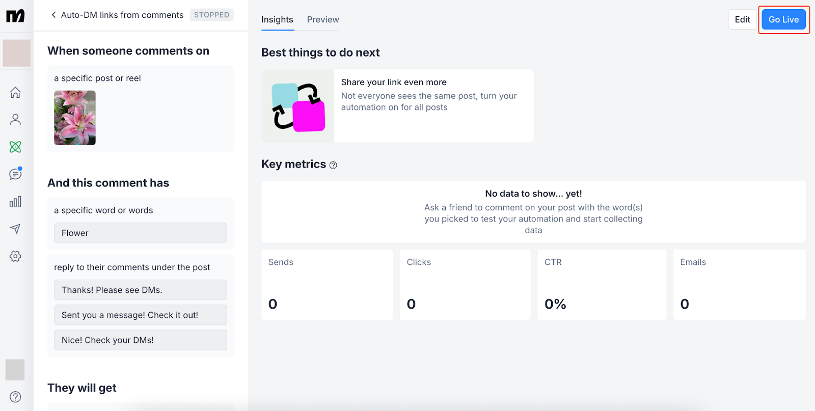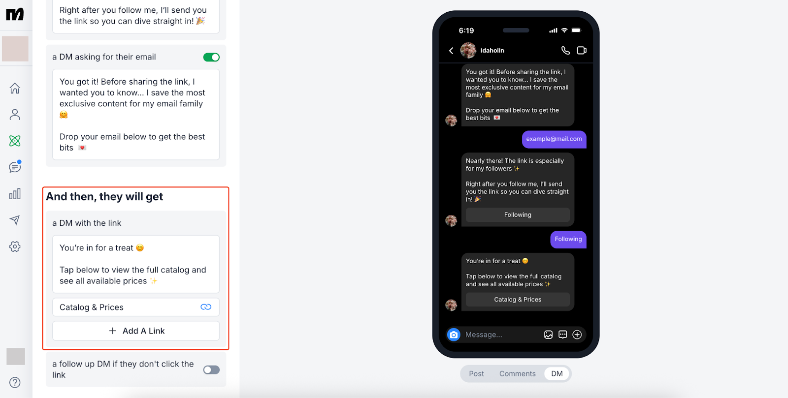 Auto-DM Links from comments allow you to automatically reply to Instagram comments and manage key interactions effortlessly. Use it to boost engagement, capture email addresses, send follow-up offers, and more. By automating these actions, you save time and create more meaningful, timely connections with your audience.