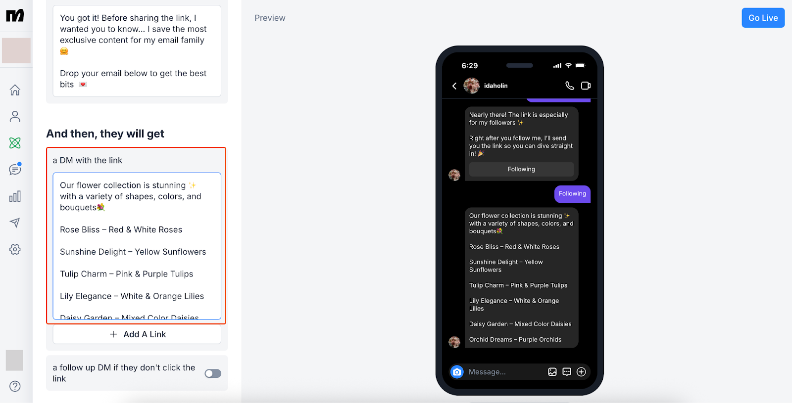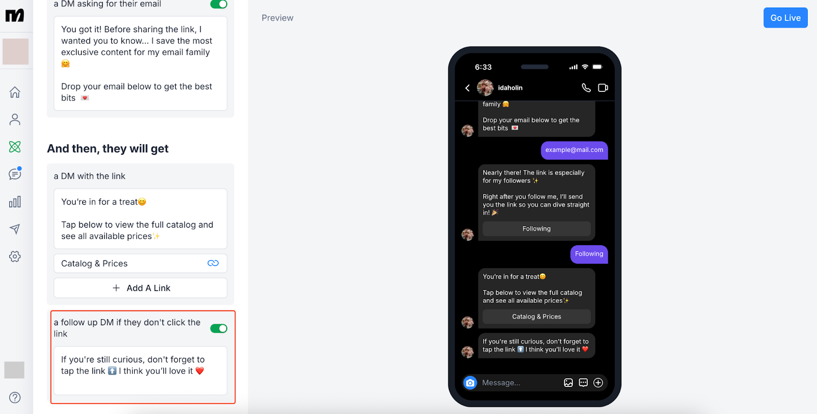 Optional: Send a follow-up DM if the link isn’t clicked. Set up a follow-up message to re-engage contacts who didn’t click the link. This helps keep the conversation going and increases the chances of turning initial interest into action.