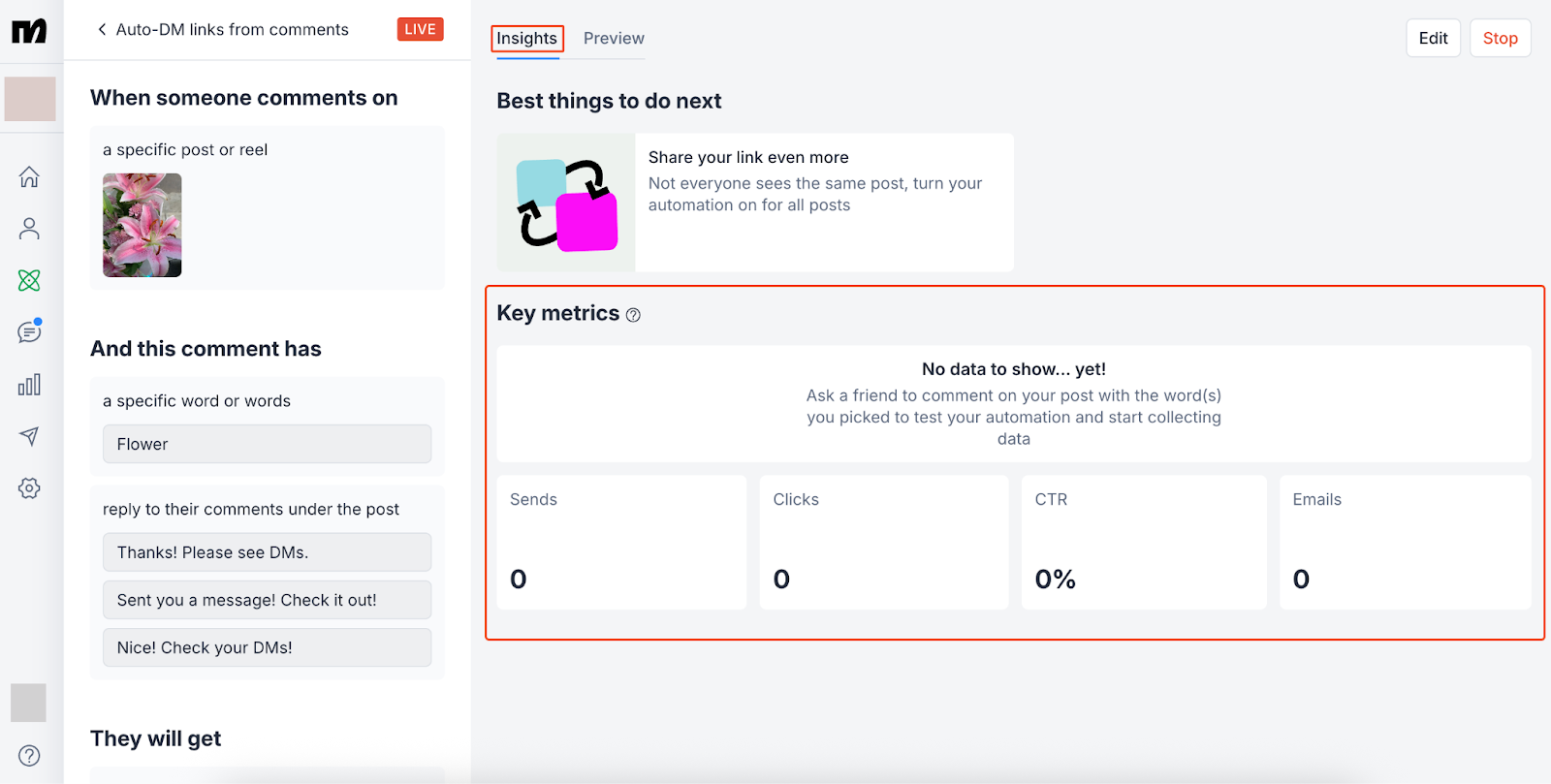 Once your automation goes live, you’ll be redirected to the Insights tab, where you can monitor its performance.