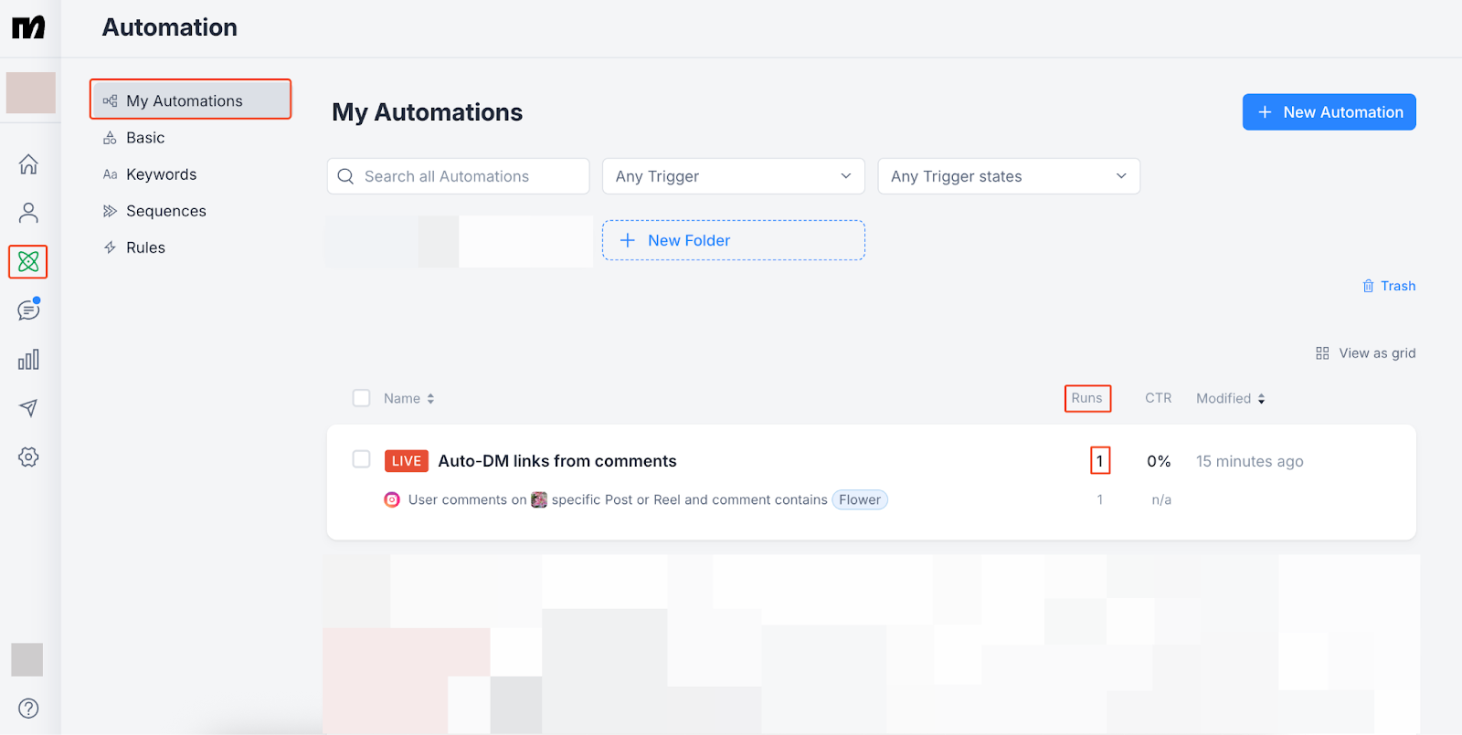- Open the Automations tab and find the Auto-DM links from comments automation in the list.