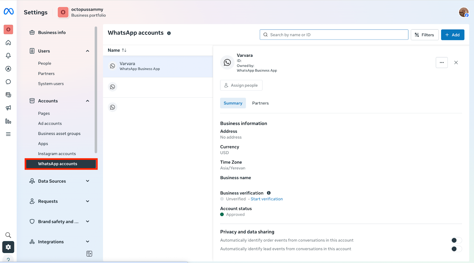 - Under the Accounts section, click on WhatsApp accounts to view and manage your existing WhatsApp accounts.