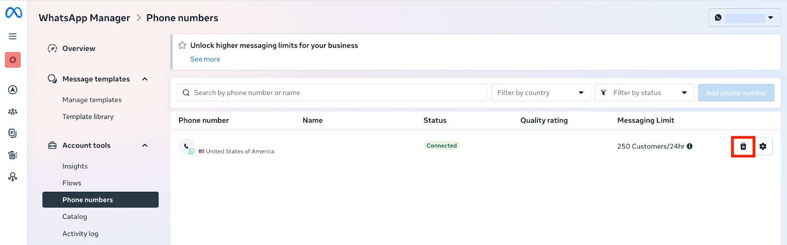 - Locate the number you wish to remove and click the trash can icon to delete it.