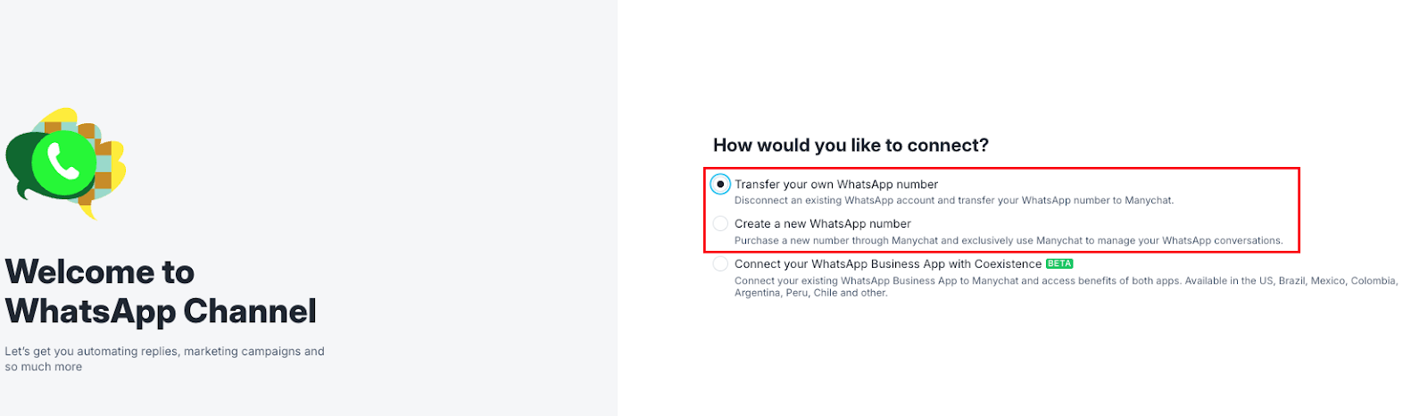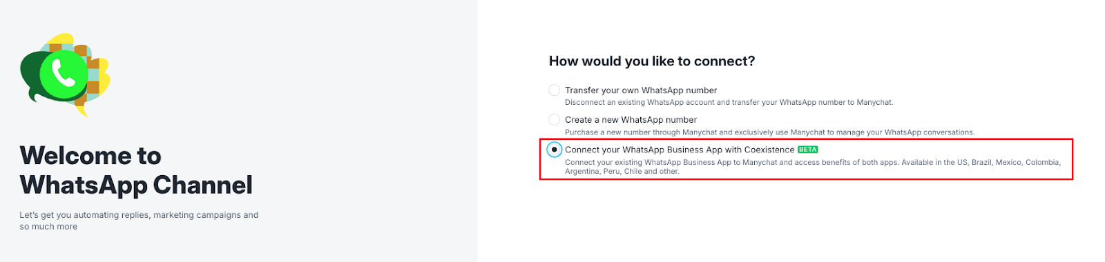 - Connecting via Coexistence [BETA]. Review the requirements outlined in the article: Connect your WhatsApp number to Manychat with Coexistence [BETA]