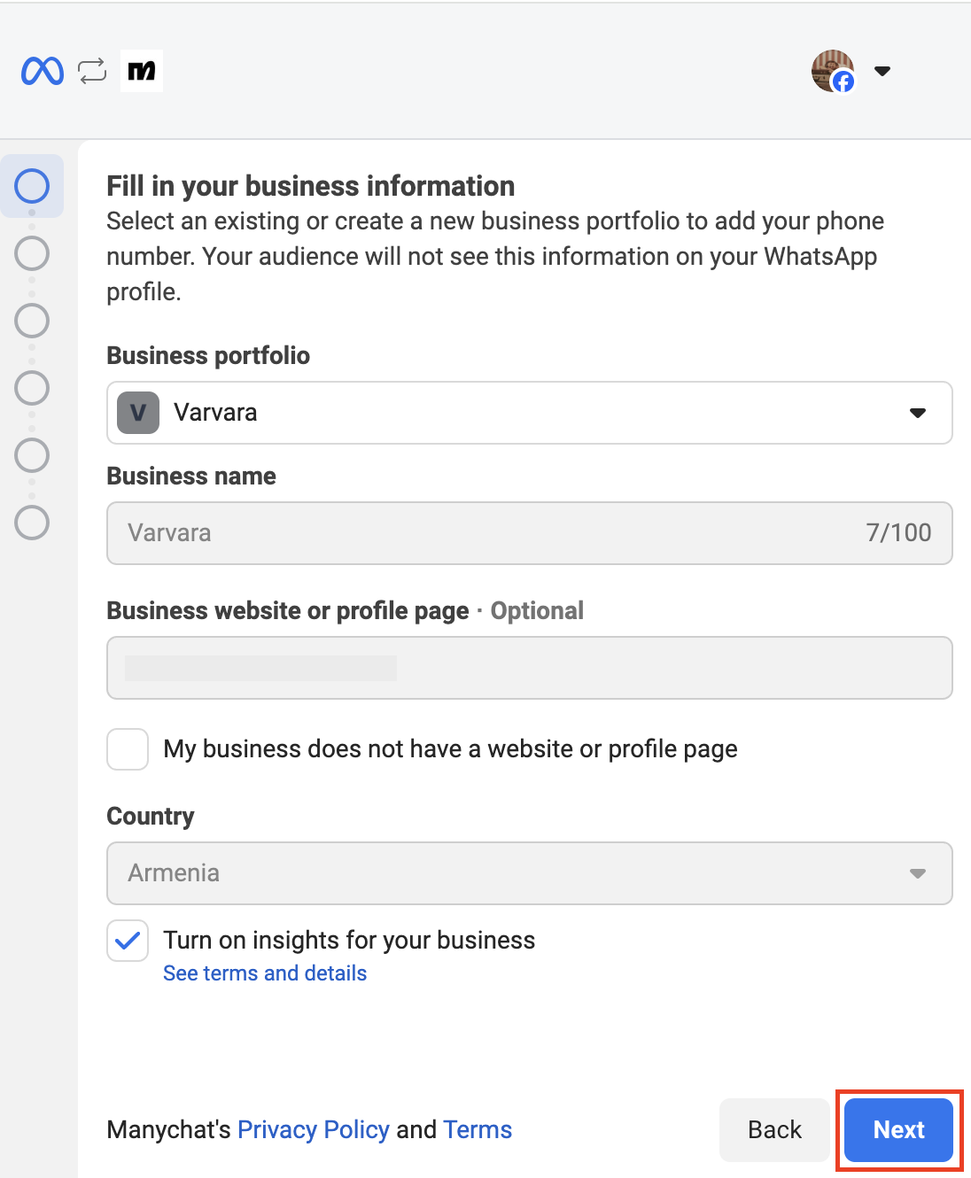 - Follow the next steps to complete the connection, which will link your WhatsApp Business app to your business portfolio once it's finished.