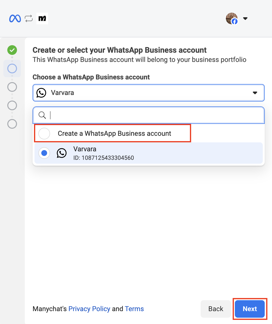 When prompted to select a WhatsApp Business account, choose Create a WhatsApp business account.