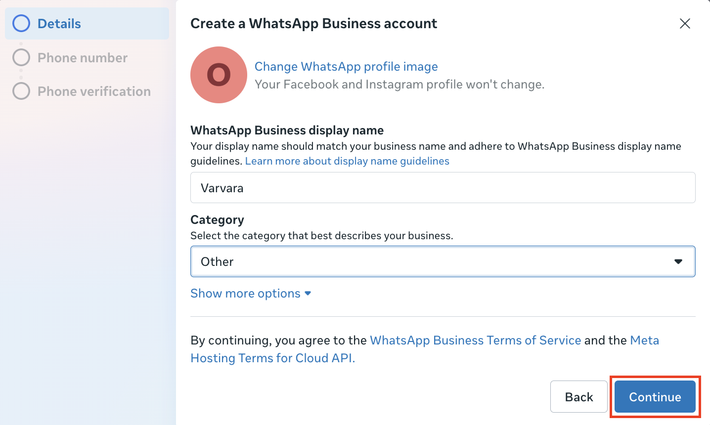Enter your business details and continue through the steps to register your number and create the new WABA.