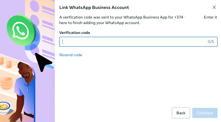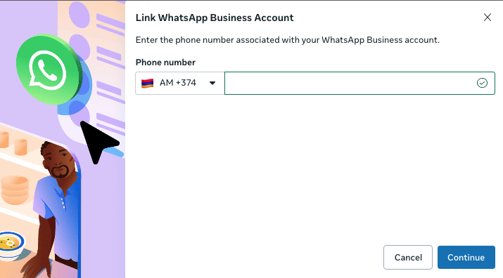 - Enter the phone number associated with your WhatsApp Business account and click Continue.