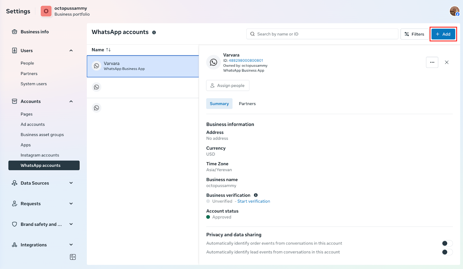 - From your Meta Business Suite, go to WhatsApp accounts and click Add.