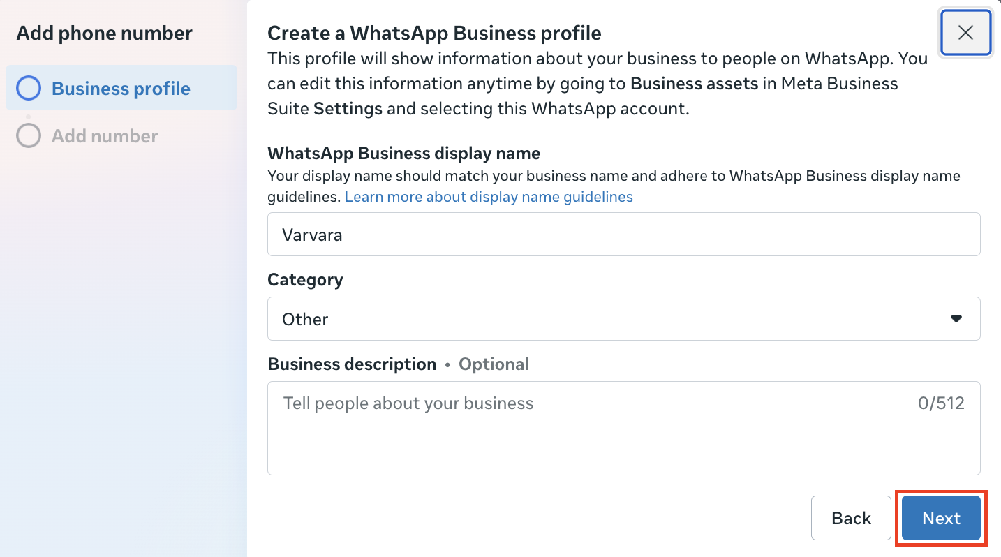 - In the window that opens, fill in WhatsApp business profile information, then click Next.
