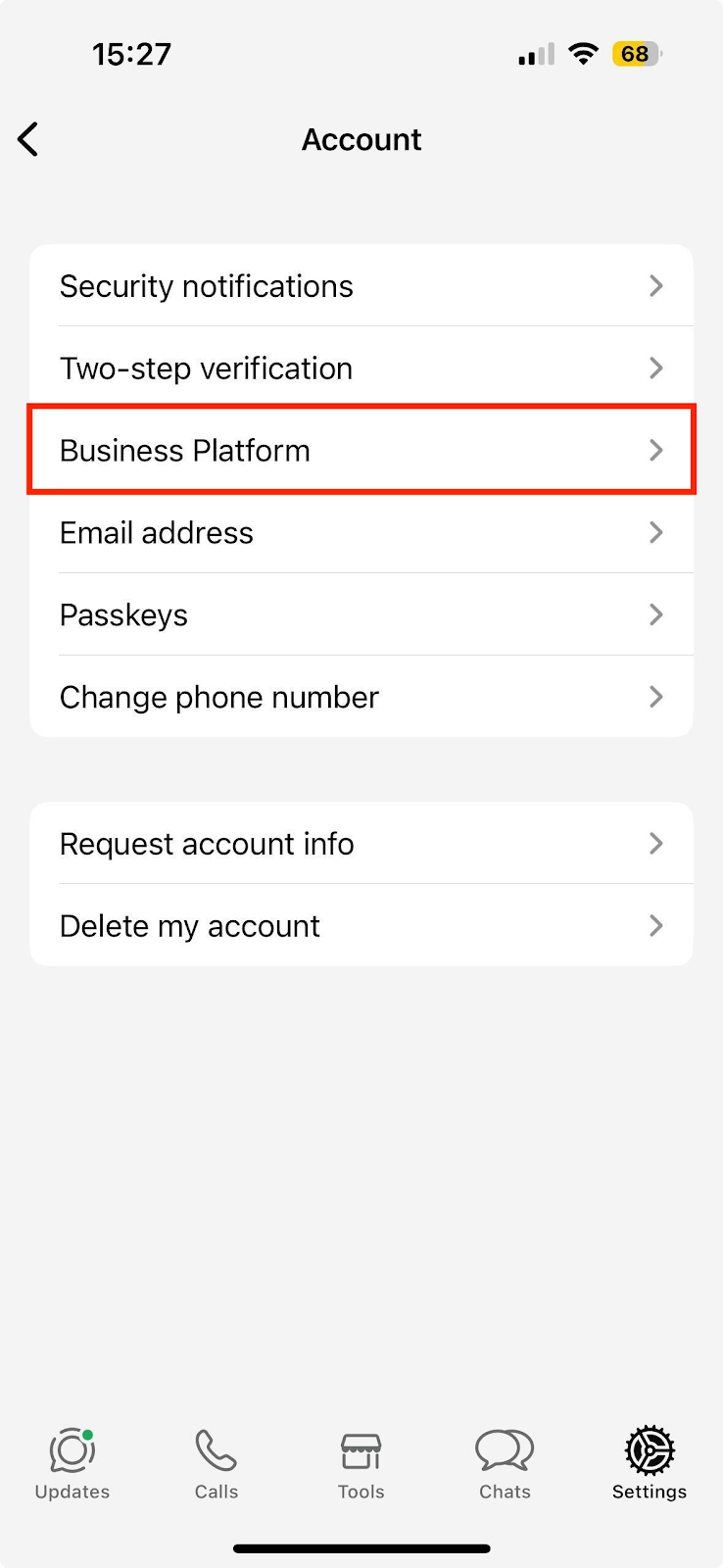 Next, go to the WhatsApp business app and open Settings > Account > Business platform.
