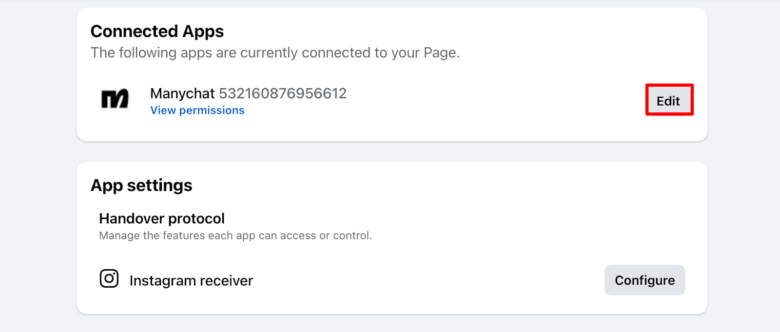- Under Connected apps, click the Edit button next to Manychat’s name.
