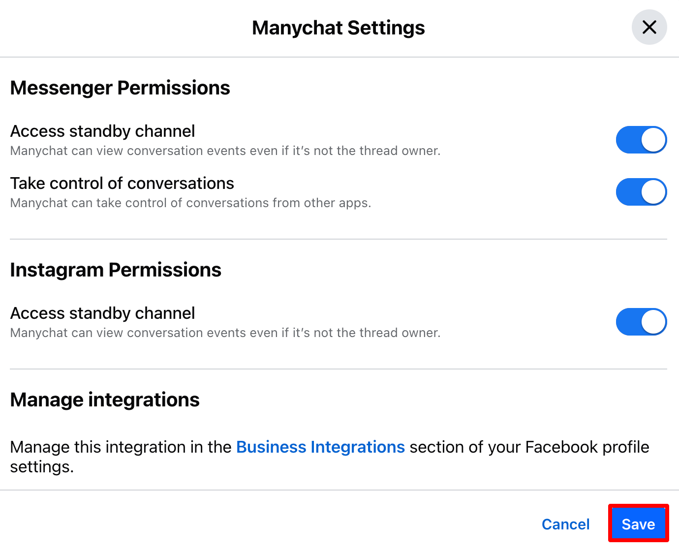 Once you’ve added Manychat as a default app, you have to check if the advanced messaging settings are on for Manychat: