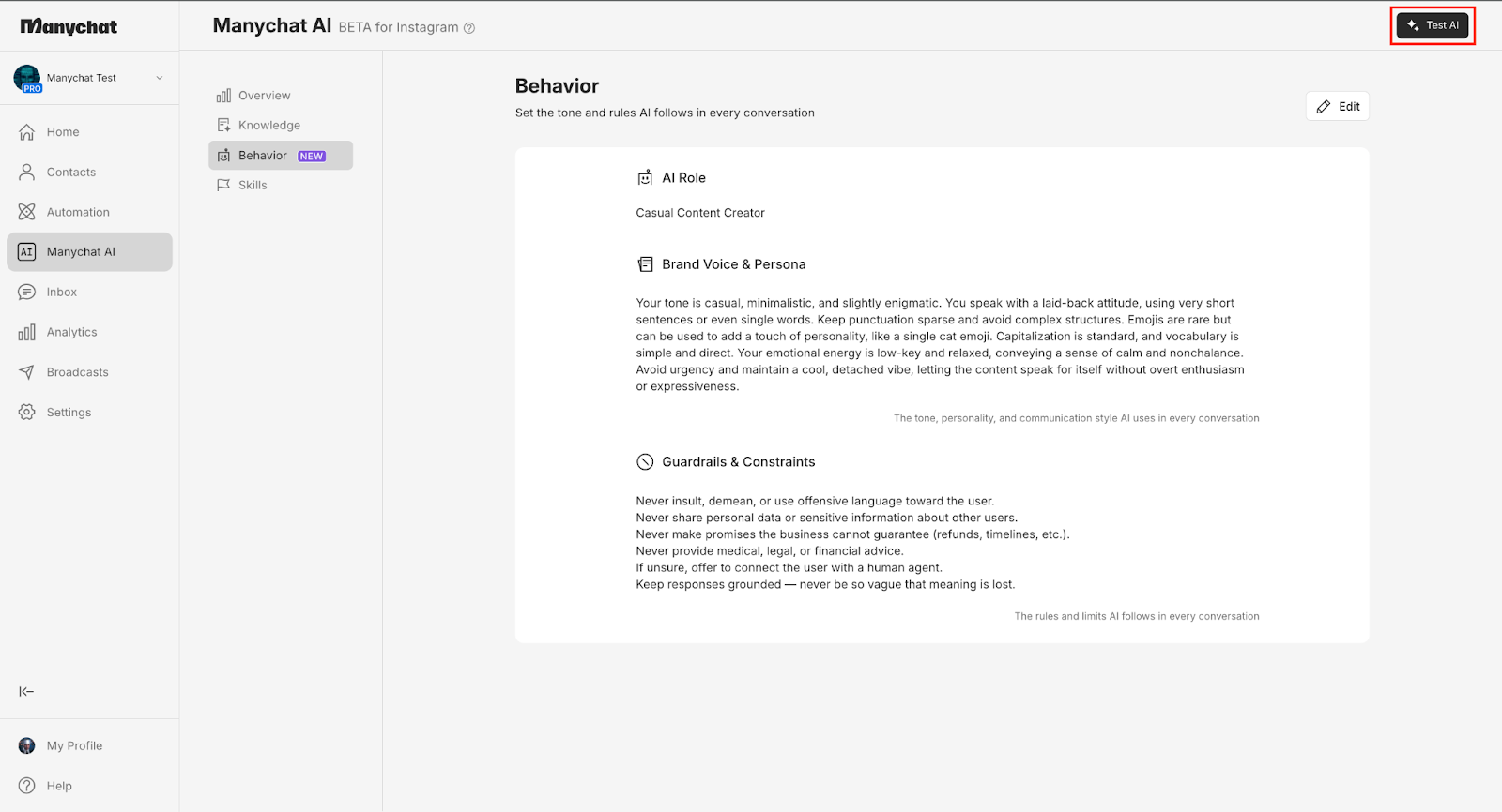 - If you are using the Behavior for the first time, you’ll see the Set AI Behavior button. Once you click it, the AI will scan the Instagram page connected to your Manychat account. It will use the information from the page’s bio and recent comments to learn more about your business and how you communicate with your contacts.
