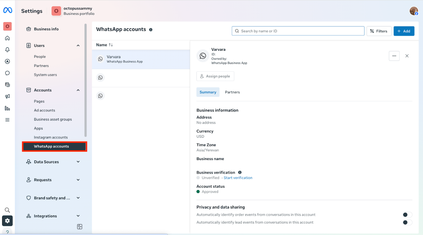 - En la sección Accounts (Cuentas), haz clic en WhatsApp accounts (Cuentas de WhatsApp).