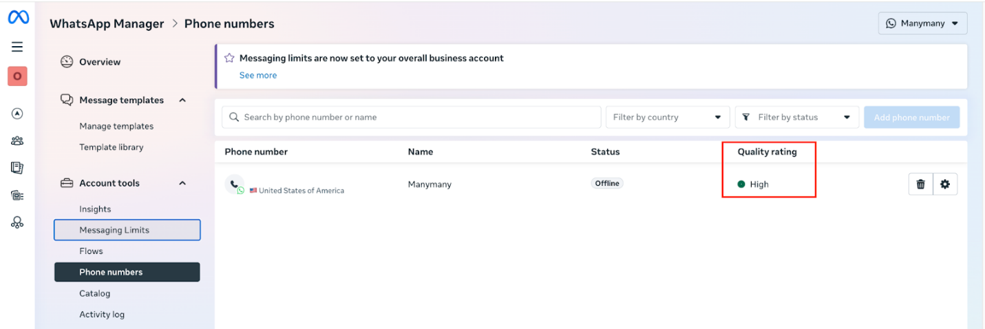 También puedes supervisar la calidad de las plantillas y los números de teléfono en el Administrador de WhatsApp. Siguiendo los mismos pasos que se usan para consultar tu límite de mensajes actual, ve a WhatsApp Manager (Administrador de WhatsApp) y consulta la pestaña Quality rating (Calificación de calidad).