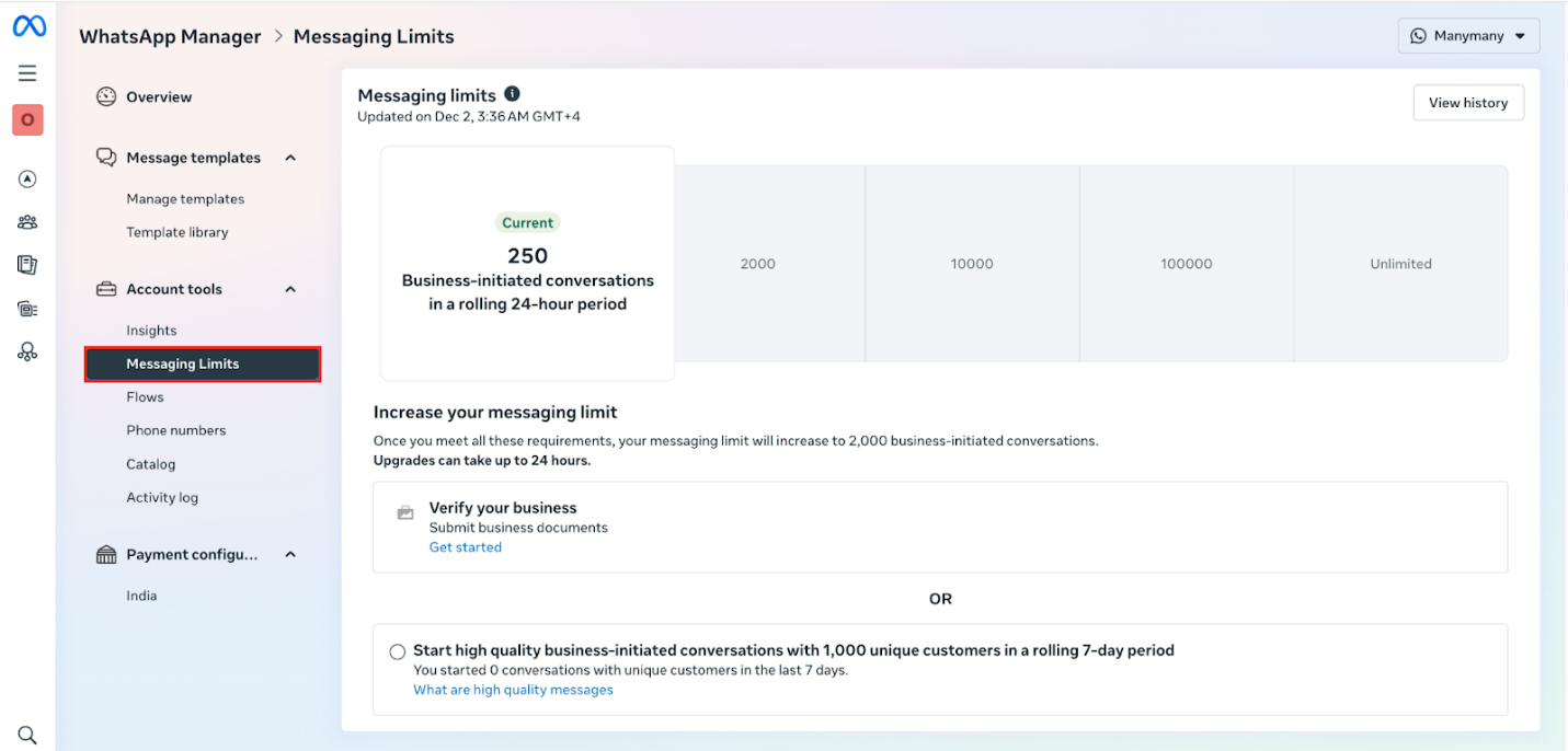 - Haz clic en la pestaña Messaging Limits (Límites de mensajes) para revisar tus límites actuales.