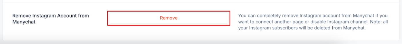 - Desplázate hacia abajo hasta el final de la página y busca la sección Remove Instagram Account from Manychat (Elimina una cuenta de Instagram de Manychat).