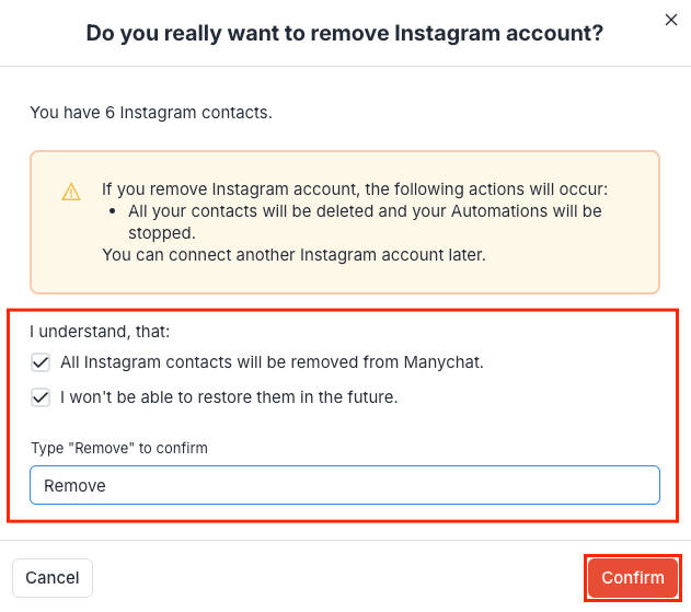 ⚠️ Importante: Eliminar la página eliminará permanentemente todos los contactos de Instagram vinculados a esta cuenta de Manychat.