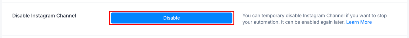 Si quieres pausar temporalmente tu canal de Instagram y todas las automatizaciones relacionadas, puedes desactivar la cuenta de Instagram en lugar de eliminarla temporalmente. Desactivar el canal no eliminará tus contactos ni automatizaciones.