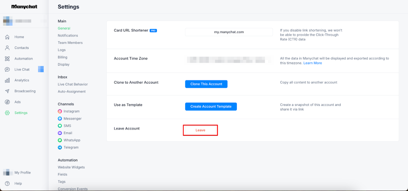 - Desplázate hacia abajo hasta el final de la página y haz clic en Leave (Abandona) para abandonar la cuenta.