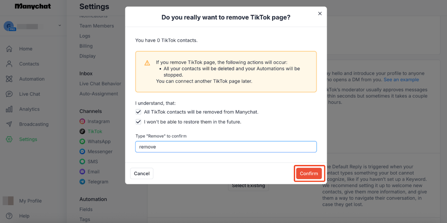 - Haz clic en Remove (Elimina) para eliminar tu canal de TikTok de Manychat.