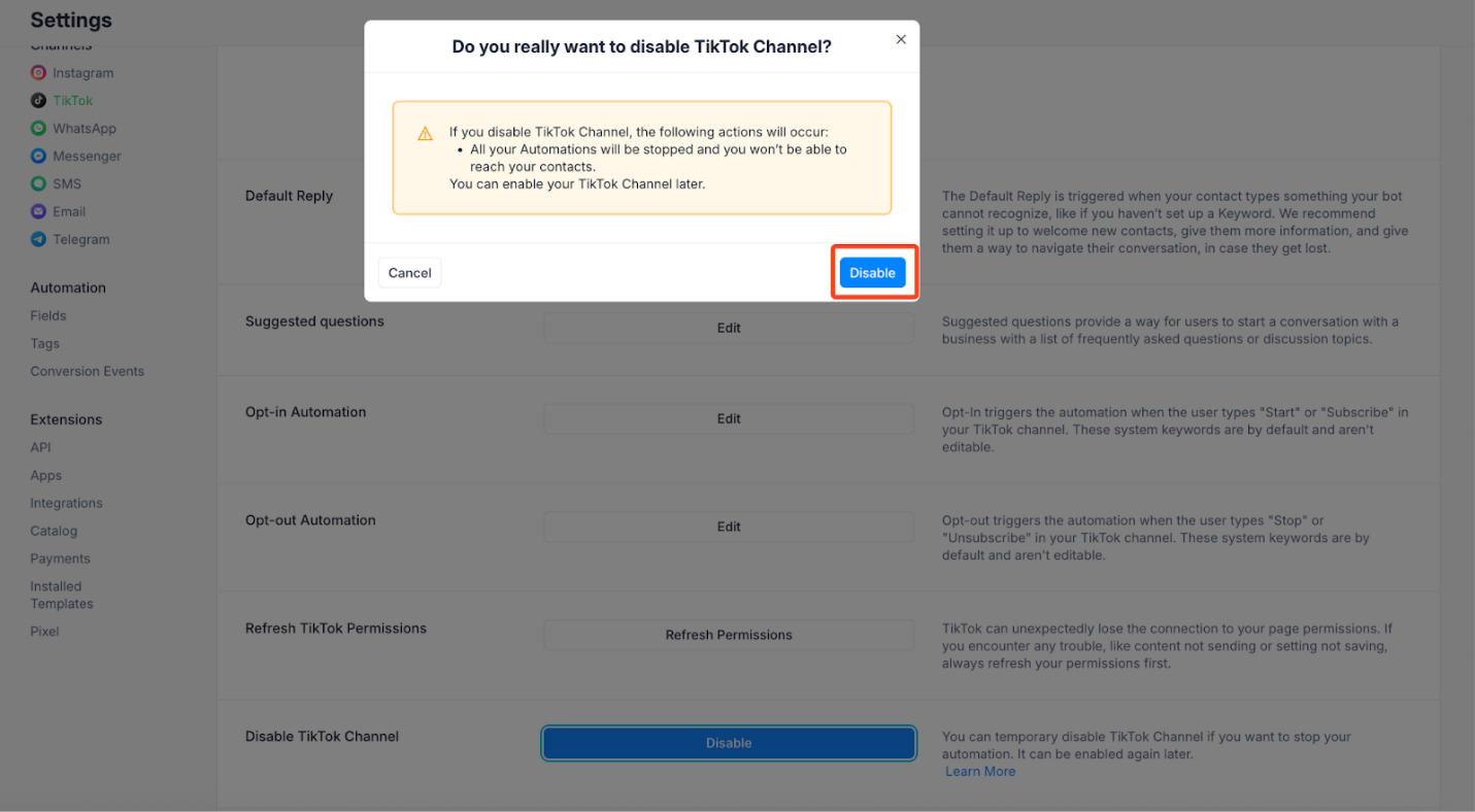 Si solo quieres pausar tu actividad, la mejor opción es desactivar el canal. Esta opción pone las automatizaciones y mensajes de TikTok en pausa temporalmente y mantiene tu configuración, contactos y automatizaciones seguros para usarlos más adelante.