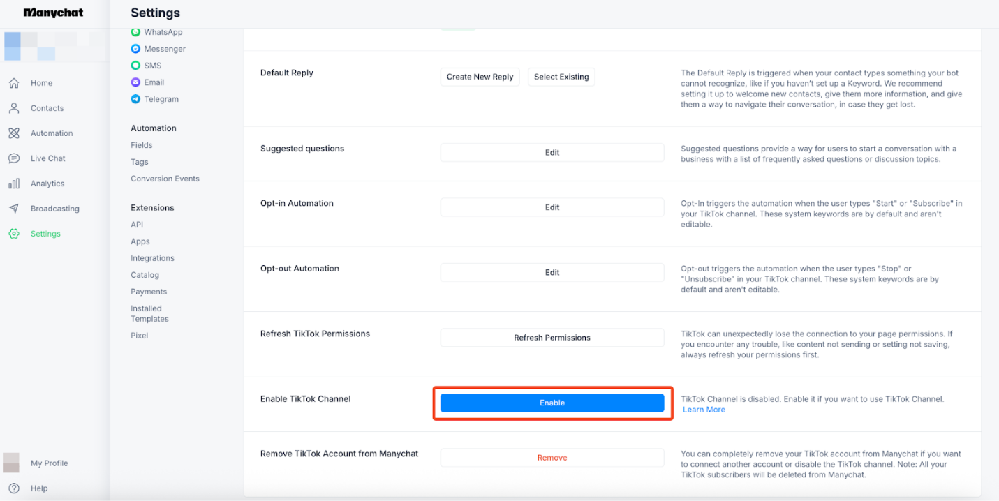 - Abre Settings (Configuración) en tu cuenta de Manychat y ve a la pestaña TikTok.