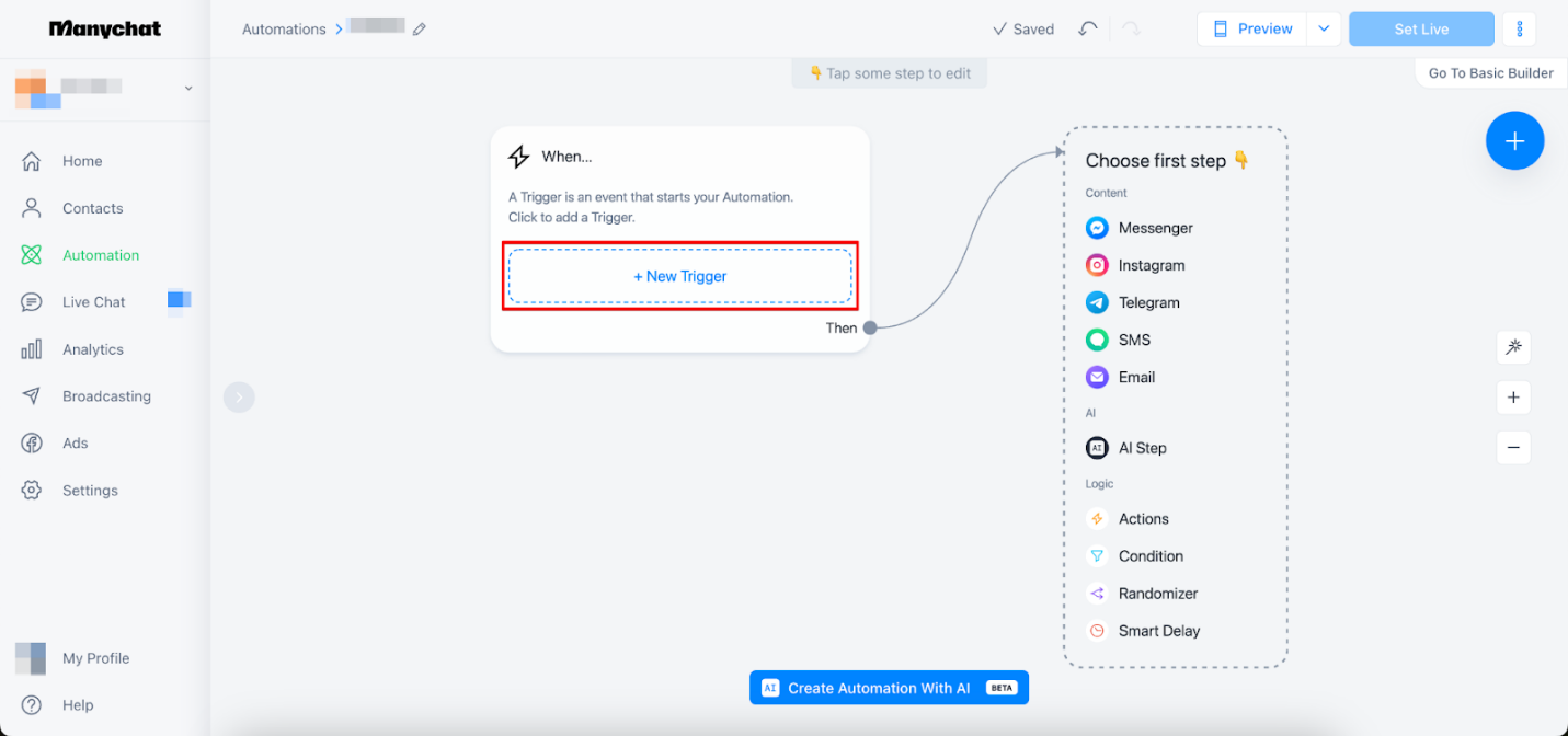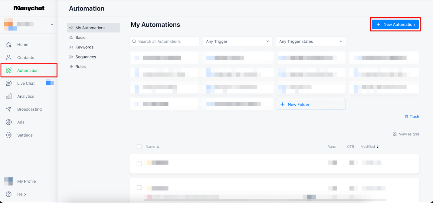 - Abra o espaço de trabalho da Manychat e clique na guia Automação na barra lateral.