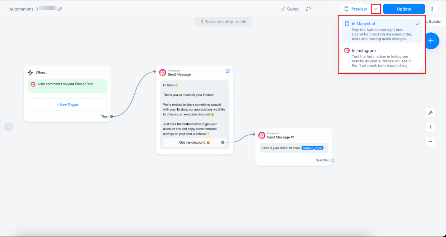 - Você pode escolher entre visualizar a automação na Manychat ou diretamente no Instagram.