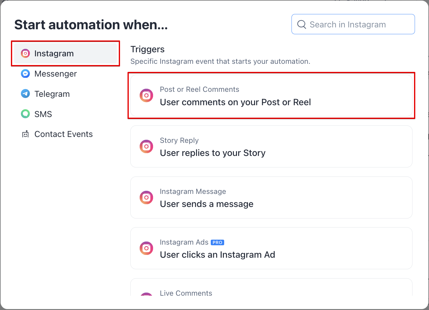 - Selecione o gatilho O usuário comenta em sua Publicação ou Reel na guia Instagram.