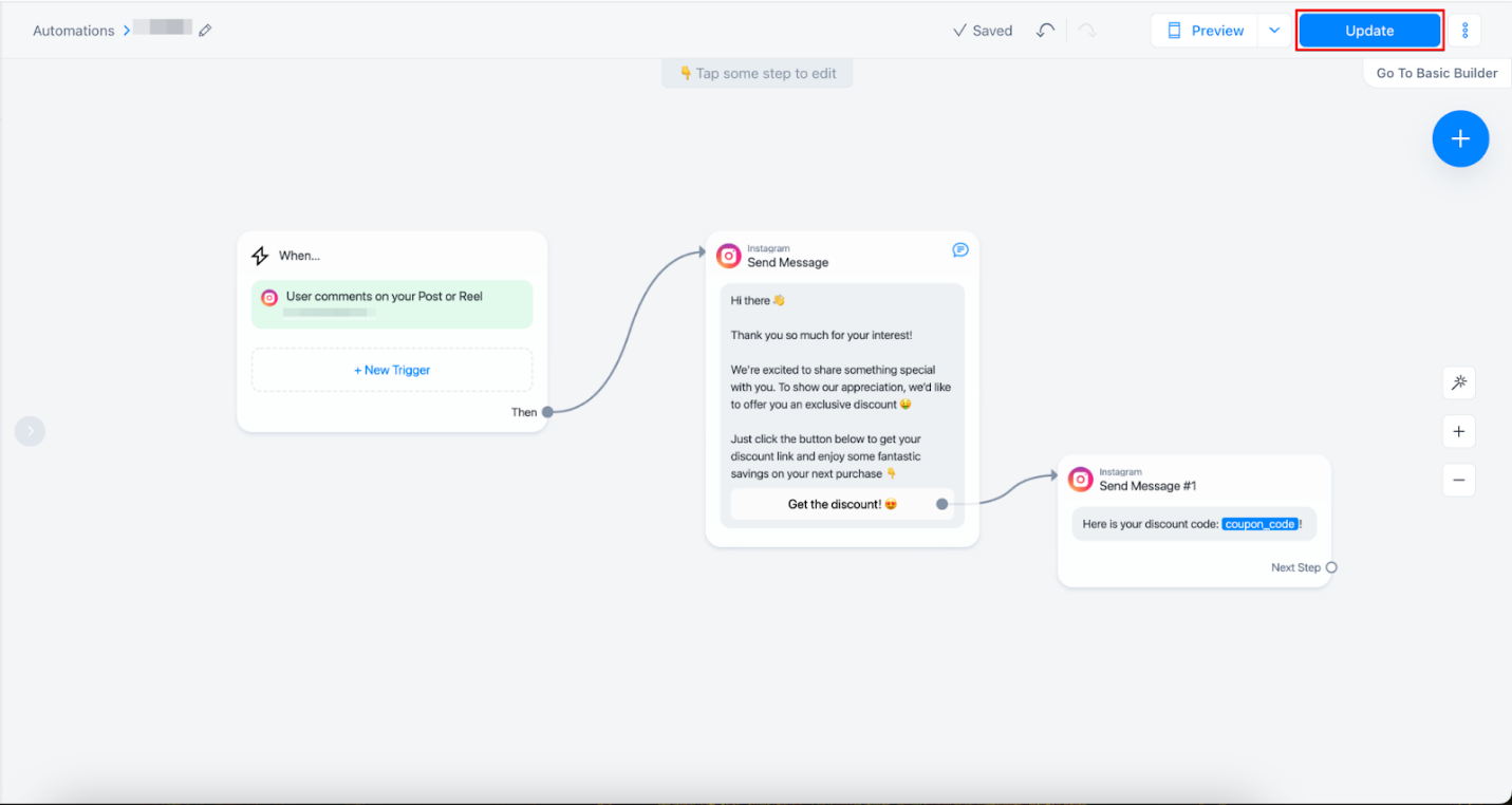 - Volte à automação que contém o gatilho de Resposta a Comentários do Instagram.