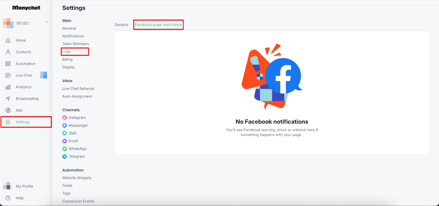 Na sua conta Manychat, você pode verificar quaisquer avisos, bloqueios e desbloqueios relacionados à sua página do Facebook, navegando até a seção correta. Basta seguir estas etapas: