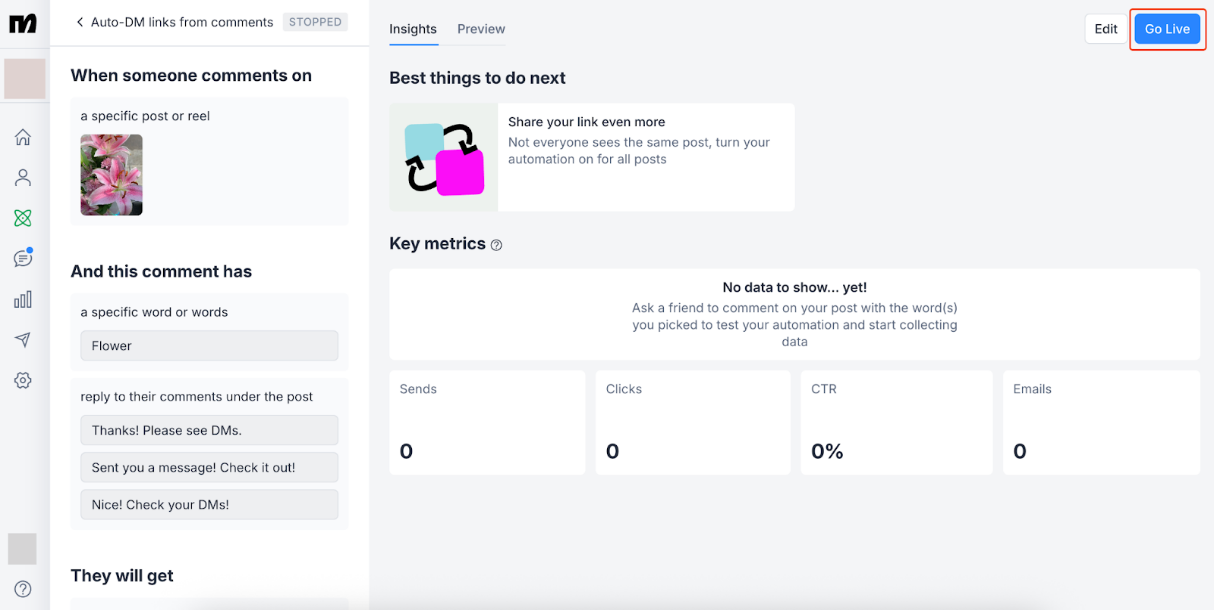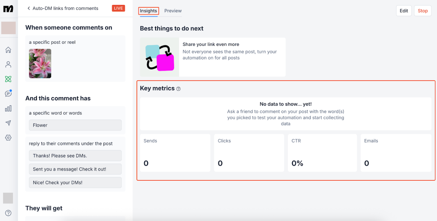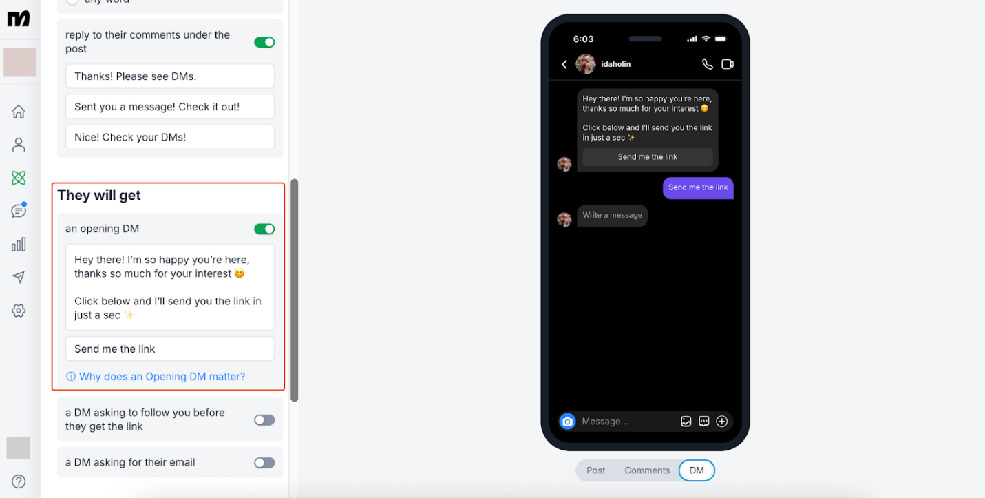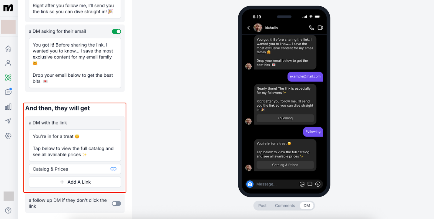 Links de mensagens diretas automáticas a partir de comentários permitem que você responda automaticamente a comentários do Instagram e gerencie interações importantes sem esforço. Use-os para aumentar o engajamento, capturar endereços de e-mail, enviar ofertas de acompanhamento e muito mais. Ao automatizar essas ações, você economiza tempo e cria conexões mais significativas e oportunas com seu público.