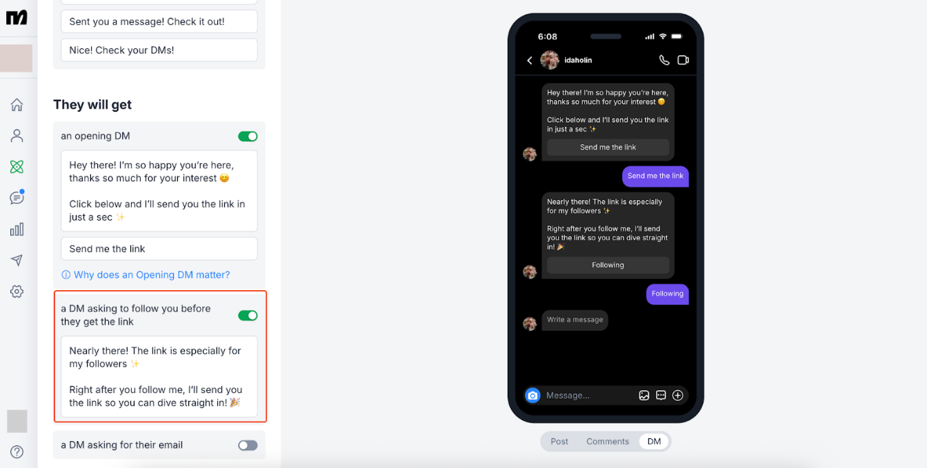 Opcional: peça aos usuários que sigam você antes de enviar o link. A Manychat pode verificar se um usuário já segue sua conta do Instagram. Caso contrário, uma mensagem direta adicional os incentivará a segui-lo antes que o link seja enviado. Isso ajuda a incentivar o crescimento da audiência, garantindo que seu conteúdo seja compartilhado apenas com seguidores engajados.