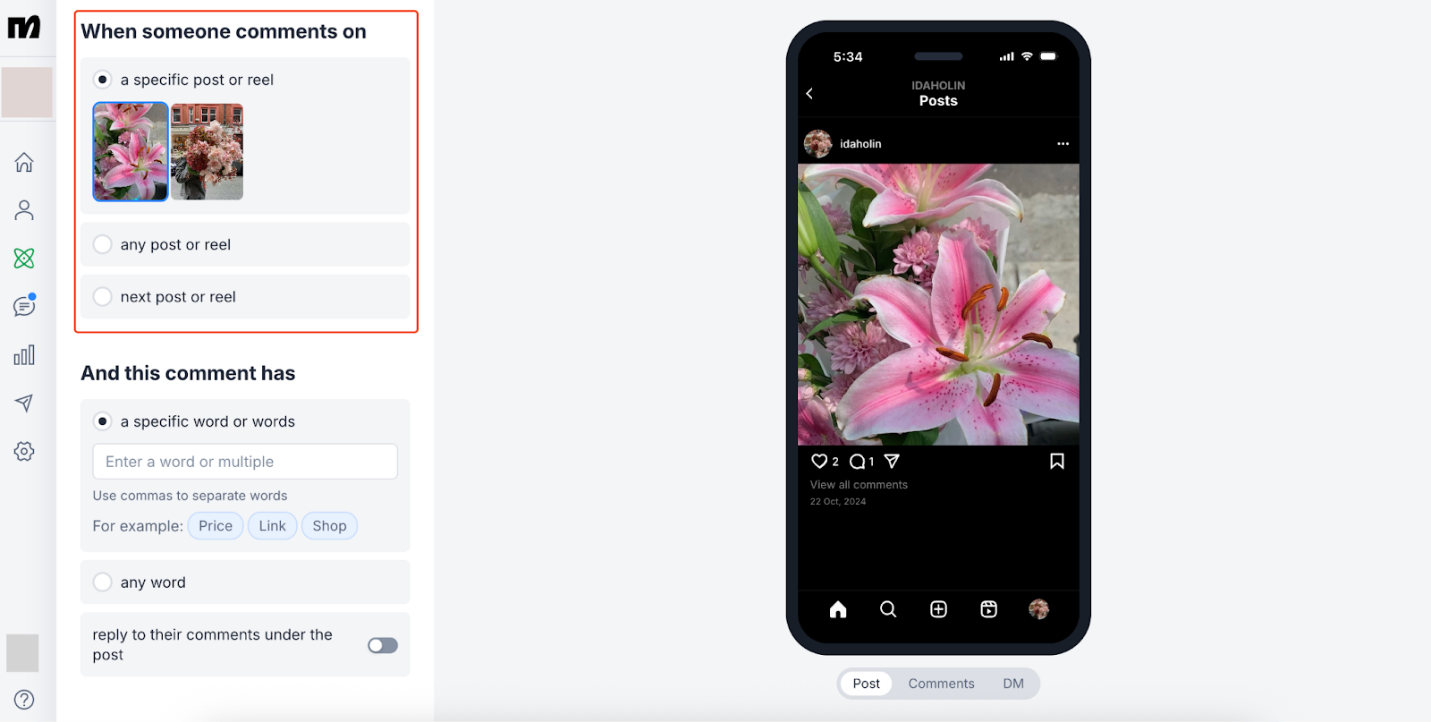 - Selecione uma publicação ou um reel que irá acionar a automação. Como primeiro passo, você deverá selecionar os comentários da publicação ou do reel que irão enviar uma mensagem direta ao usuário. Existem três opções aqui: