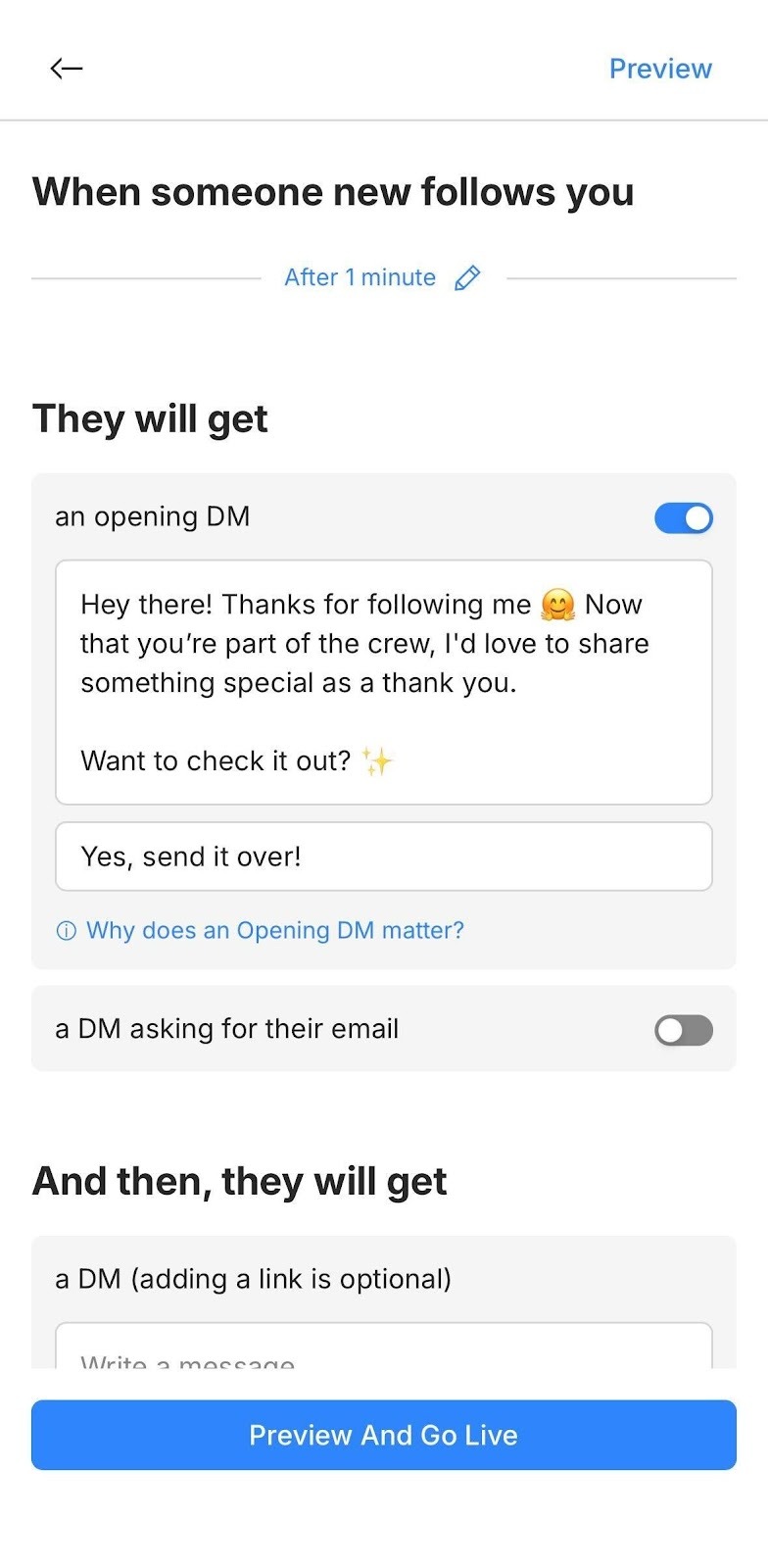 - Em seguida, você pode adicionar uma DM para solicitar o e-mail dos seguidores: uma mensagem de acompanhamento enviada após a DM de abertura que convida os usuários a compartilhar seus endereços de e-mail. Isso ajuda você a aumentar sua lista de assinantes e se conectar com seu público além do Instagram. Para adicionar esta mensagem, ative a opção ao lado de DM para solicitar o e-mail.