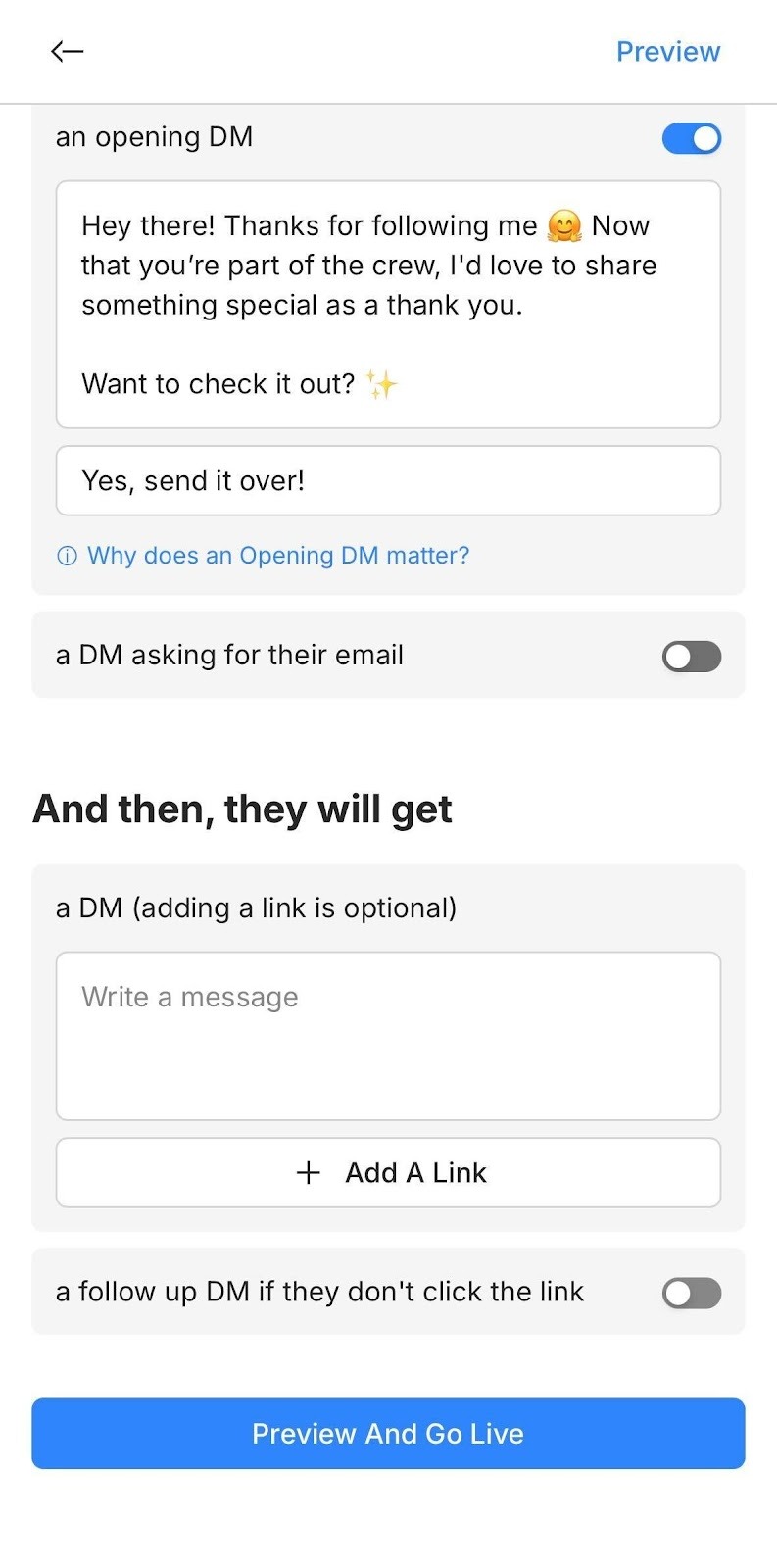 - Por fim, adicione uma DM com o link. Ele é enviado automaticamente após o contato tocar no botão na DM de abertura. Você pode incluir até três links para direcionar os seguidores para páginas como produtos, sites comerciais ou conteúdo de afiliados ou manter tudo simples enviando apenas uma mensagem de texto.